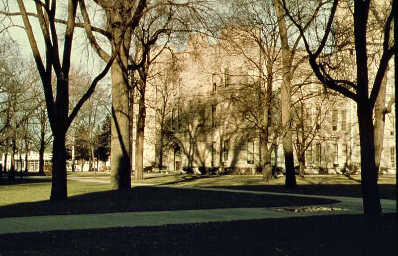 West end of Old Main in January, 1967. There's the sidewalk - right there. This is the elm tree. Theoretically it should have had Phloem Necrosis along with a lot of other elm trees. Now I can't prove it and this is unscientific, but I think this elm tree has survived because they filled up the space between Old Main and Pem Hall. There was a low spot here about 2 feet down, and they filled it up and they buried the roots of this tree about 2 feet. So I don't think this elm tree ever suffered from drought. And when elm trees suffer from drought they're very subject to Phloem Necrosis. Well, this tree is still with us, thank goodness, a beautiful tree right there.