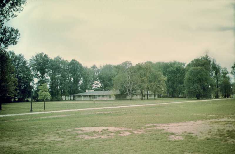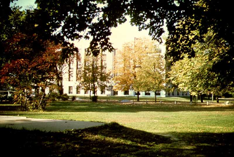 Cafeteria, ca. 1943. [We are] facing east and looking through the two trees at the temporary building which housed the cafeteria. This slide was made from a picture taken about 1943. They taught Geography, especially Psychology, some language and some other things in this building. Now these three trees here, I went by this spot one day and saw Mr. Monere who was grounds keeper at that time. I said, "Mr. Monere, what do these stakes mean over here?" "Oh, we're going to put a temporary building in here." "What are you going to do with these trees?" "Well," he said, "I guess we'll just have to cut them down." I said, "You go and tell Dr. Buzzard to move the building ten feet. And you say I said so." Well, he went to see Greg the business manager and Greg said, "Well, you better see Dr. Buzzard." And, sure enough---they moved the building 10 feet! And, we saved the trees! Thank goodness! Some times you have to be obstinate to get your wish.