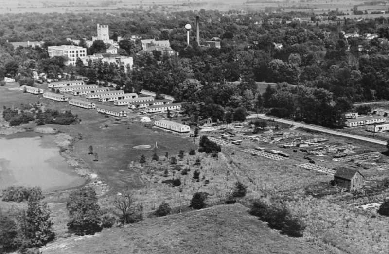 West side of Fourth Street from the 1947 Warbler. South on Fourth Street we now have the Science Building and the Gym. After the war, they put in a lot of temporary barracks so that these veterans that got married could go to school. A lot of veterans lived in here for several years. This didn't last too long. Here's the campus lake.