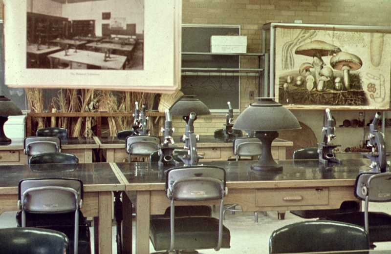Room 205 in the Life Sciences Building in 1967. This is botany laboratory room 205 in 1967. There was a 1912 picture of the [botany] laboratory so I put the two pictures together. The 1912 picture [taken from the 1913 Warbler] is the west end of Old Main and you can see the dearth of materials on the lab tables. But, the one thing that is common in both pictures is this chart of Agaricus campestris, a meadow mushroom. It's a delight to eat if you can find them. There it is, the same chart, right there. This chart, in this picture, right there. I wish it were a little brighter, but there it is in a black and white picture. So you can see 1967 and 1912 like this and this chart has -- is it still around? -- it is? -- This has been a remarkable chart because I think it came from the year one. I'm not sure about that.