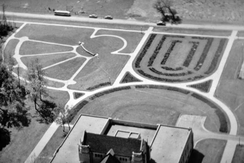 South of Booth Library. This is an aerial view of the library. Behind the library was a flower garden filled with iris. That's Cleveland Avenue. The Life Science Building is right over there to the left. In here we had an outdoor theater. It was about 4 or 5 feet up from the walkway to the top of the seats. And they had plays on this area and people sat in this semicircle to watch the plays. It lasted a few times but I think probably the mosquitoes were a little discouraging. The outdoor amphitheater was taken over by the Life Science Building. The picnic grounds were to the left of this picture in the woods. I want you to see this flower garden behind the library here. Ready?