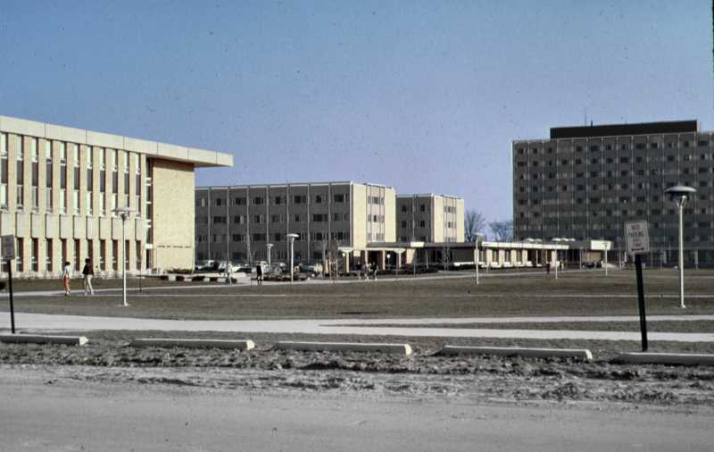 Library and beyond in January, 1963. Now, of course, here is the library. There wasn't anything beyond the library except open fields. Now look at all the building that took place down beyond the library. We have these several buildings, Life Science Building, Practical Arts Building and Thomas Hall. Anyway, the library is now pretty much at the north end of the campus and when they built the thing it was w-a-y-d-o-w-n-s-o-u-t-h at the end of the campus. So that all has happened through the years.