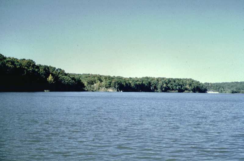 From the top of the causeway looking north in October, 1959. This causeway raised the water 13 feet. And there it is. So, we had more water supply. But now they're talking about silting and we don't have much water supply. Well... so it goes.