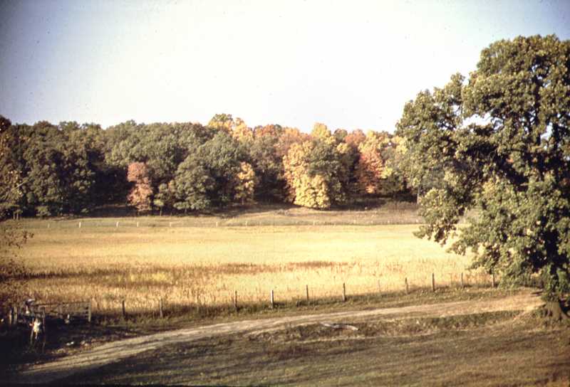 Road to the rock quarry on the east side of the present location of' the lake in about 1942 above the location of the dam. The field is now covered with water. East of the causeway damming the Embarras River is a road right along there. This used to be a beautiful spot and they called it "The Island". It's still The Island, 'cause right in here is the outlet to Lake Charleston.