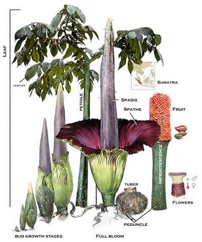 The Titan Arum or Amorphophallus titanum is a flowering plant with the largest unbranched inflorescence in the world. The plant is also known as the carrion flower or the corpse flower because the flower’s fragrance is similar to the odor of rotting meat. The Titan Arum was discovered by Italian botanist Odoardo Beccari in Sumatra in 1878. It grows wild only in the tropical forests of Sumatra.