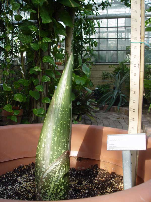 The Titan Arum was 25 inches tall with a 16 inch circumference. The best educated guess as to when the inflorescence will open and "do it's thing" is about two weeks. Stay tuned!