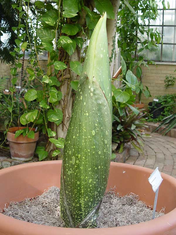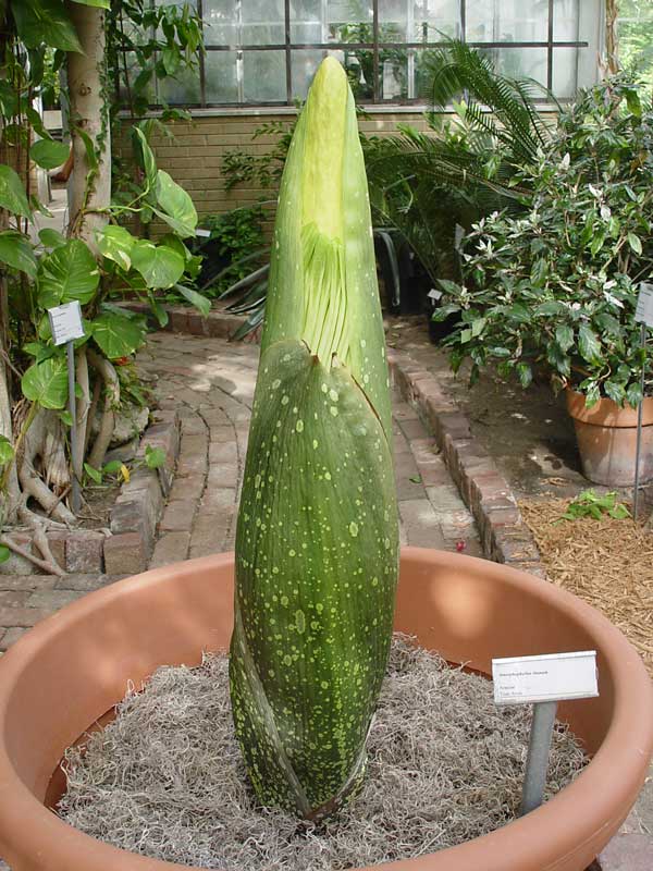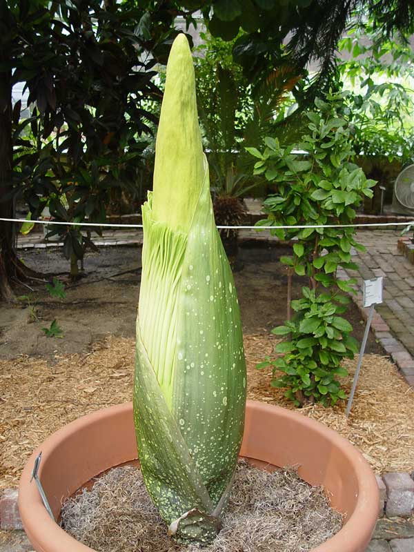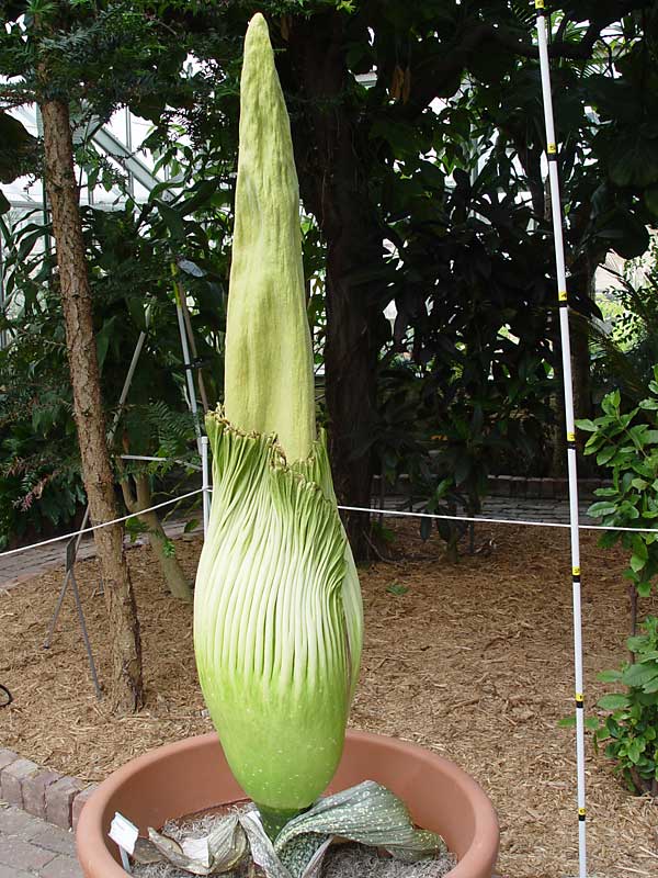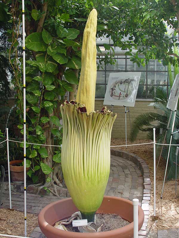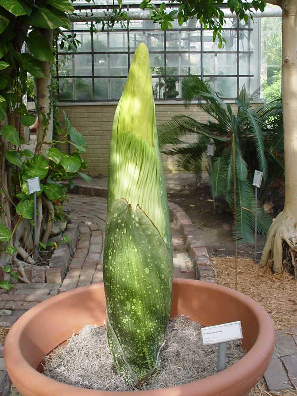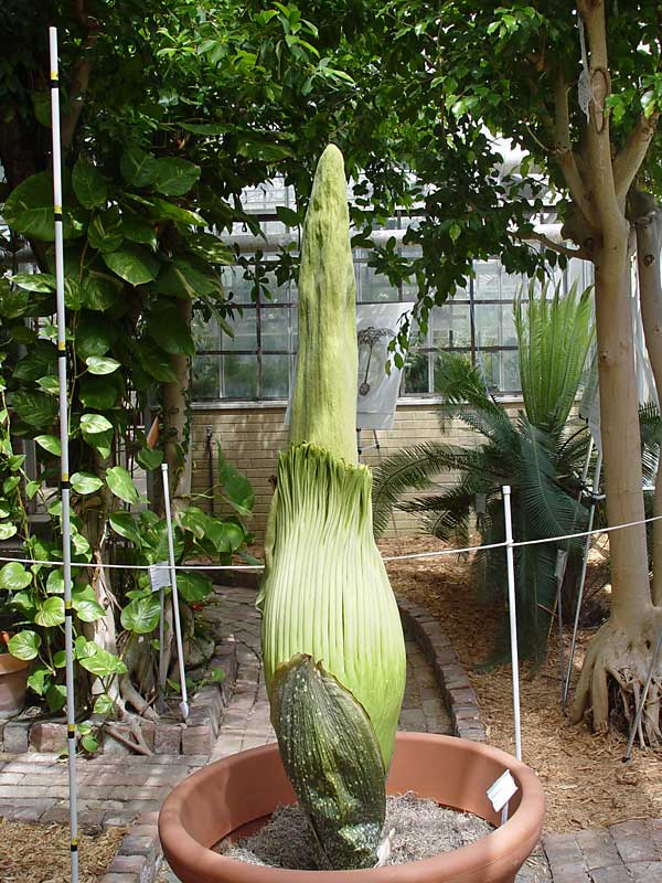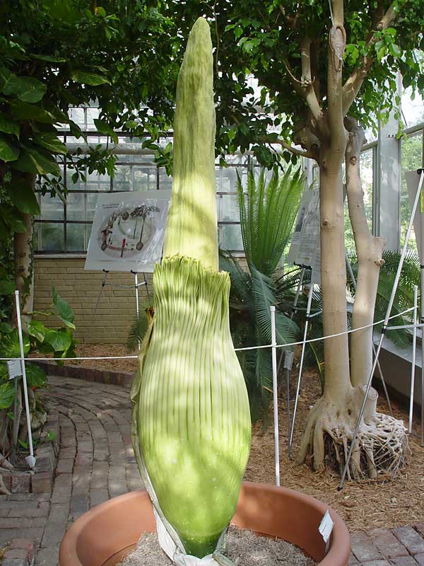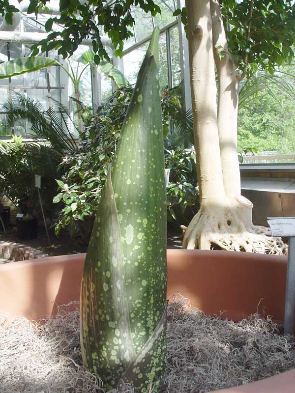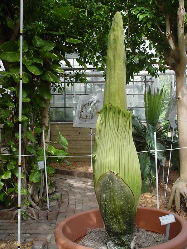 Following six and a half years of vegetative growth, the Titan Arum in the H.F. Thut Greenhouse at Eastern Illinois University produced its first inflorescence in June, 2008. And what an inflorescence it was! Its huge flower and powerful roadkill aroma attracted several hundred flies and three thousand visitors.